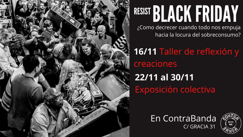 Terminamos esta reflexión invitándoos a una exposición colectiva que montamos en ContraBanda durante el “Black Friday”, que hemos renombrado: “RESIST BLACK FRIDAY – ¿Cómo decrecer cuando todo nos empuja hacia la locura del sobreconsumo?”, compuesta por más de 20 obras (dibujos, pinturas, eslogans) hechos por 7 artistas durante un taller colectivo que hicimos, de reflexión y creación sobre el tema. Esperamos que esta iniciativa siga regando la semilla del consumo sostenible y responsable. ¡Otro consumo es posible!